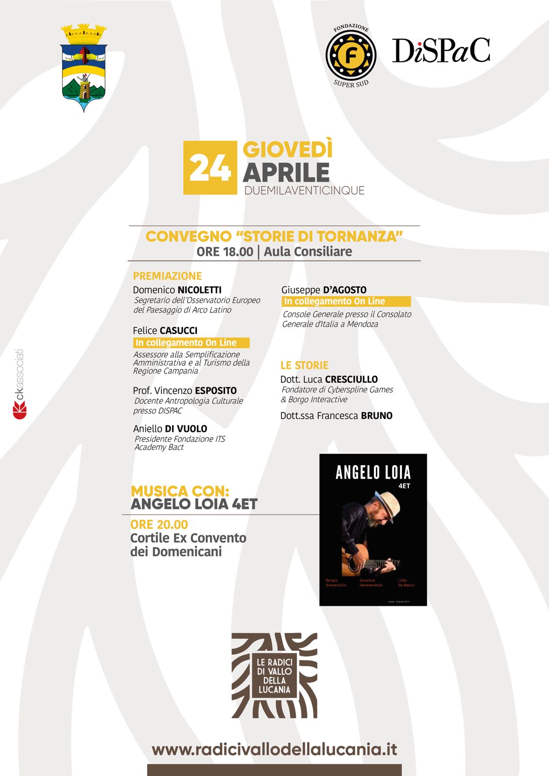 Nel corso della serata sarà dato spazio ai protagonisti delle “storie di tornanza”: tra loro, Luca Cresciullo, fondatore di Cyberspline Games & Borgo Interactive, e la dottoressa Francesca Bruno che racconterà come le tradizioni familiari siano collegate ai fenomeni migratori. A chiudere la giornata, alle ore 20:00, il concerto del quartetto Angelo Loia 4ET, che offrirà un suggestivo momento musicale in sintonia con il tema della memoria e del radicamento.